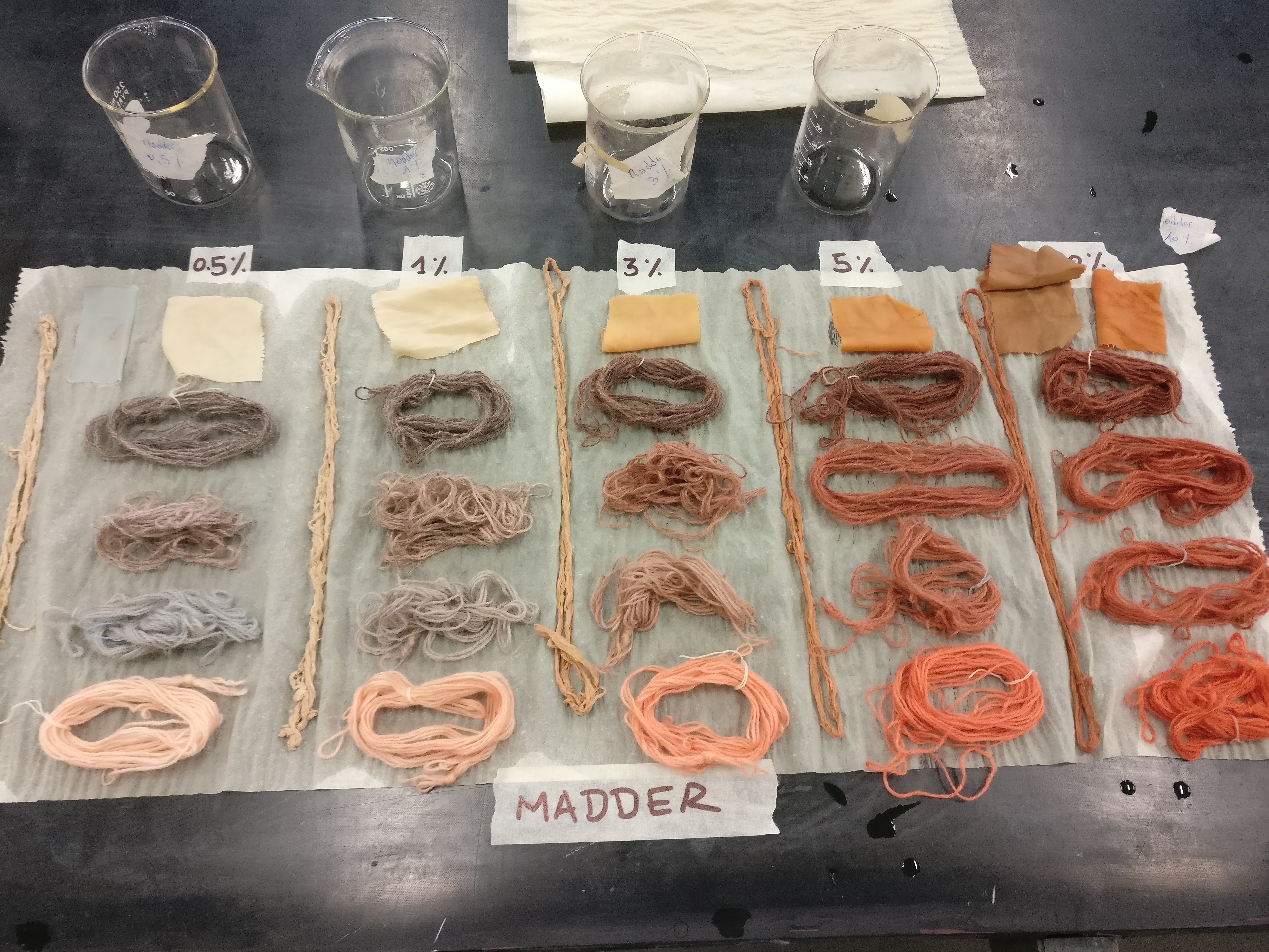 Laboratoriefärgningar för att bygga upp en receptbank: Vi arbetar med krapp, koschenill och reseda. Recept på olika procent parvis, två recept.